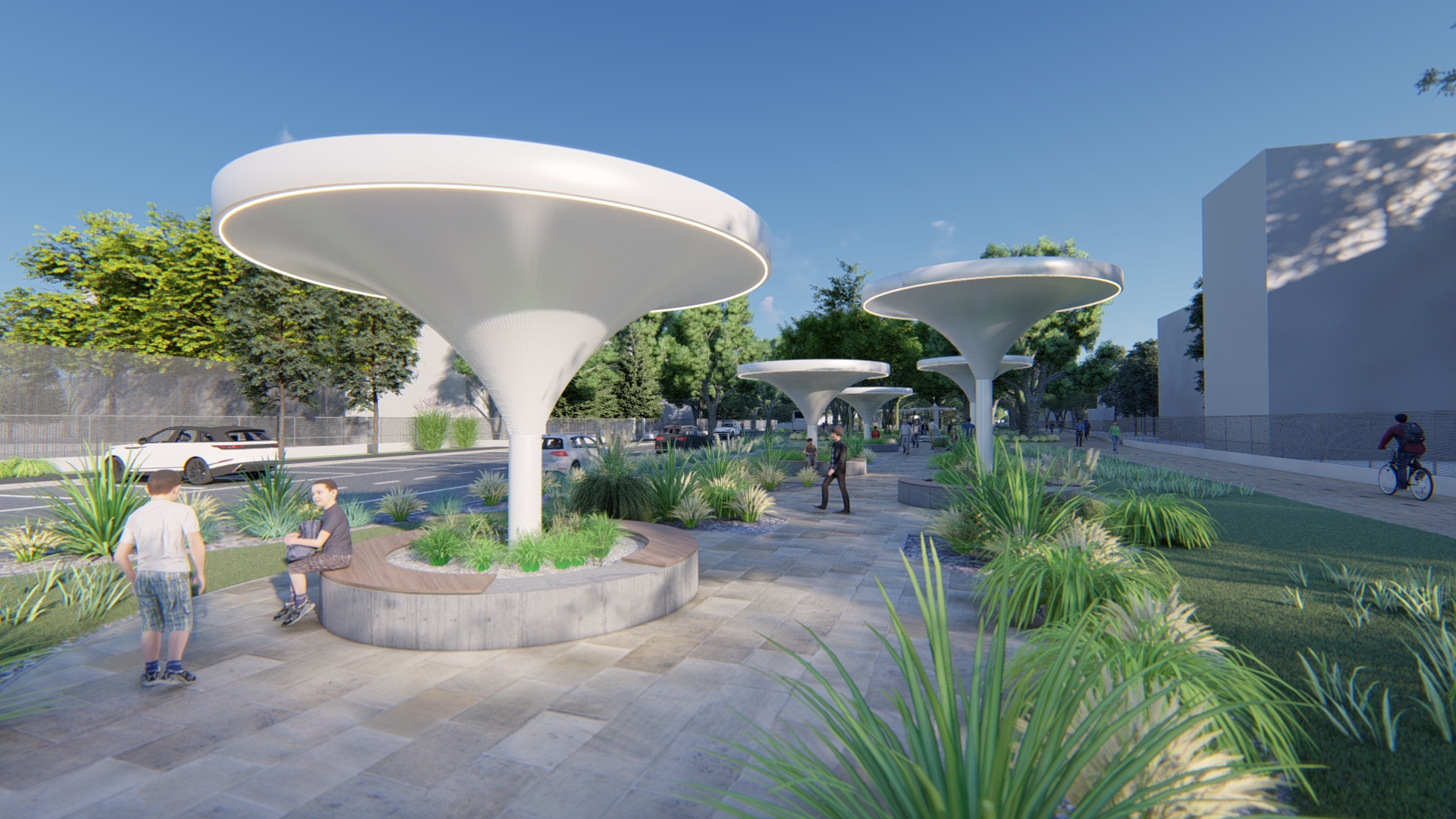 Moderné vybavenie parku: Vzniknú „smart“ prístrešky so solárnymi panelmi, automatický zavlažovací systém, verejné osvetlenie, Wi‑Fi pripojenie a uzamykateľné stojany na bicykle.